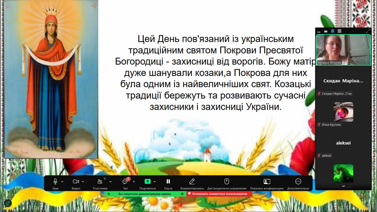З цієї нагоди класний керівник Варвара ФІЛЬОВА провела для студентів групи Т-23 виховну годину, присвячену Дню захисників і захисниць України, Дню Українського козацтва та святу Покрови Пресвятої Богородиці.