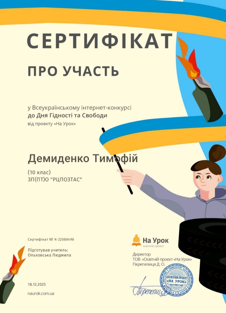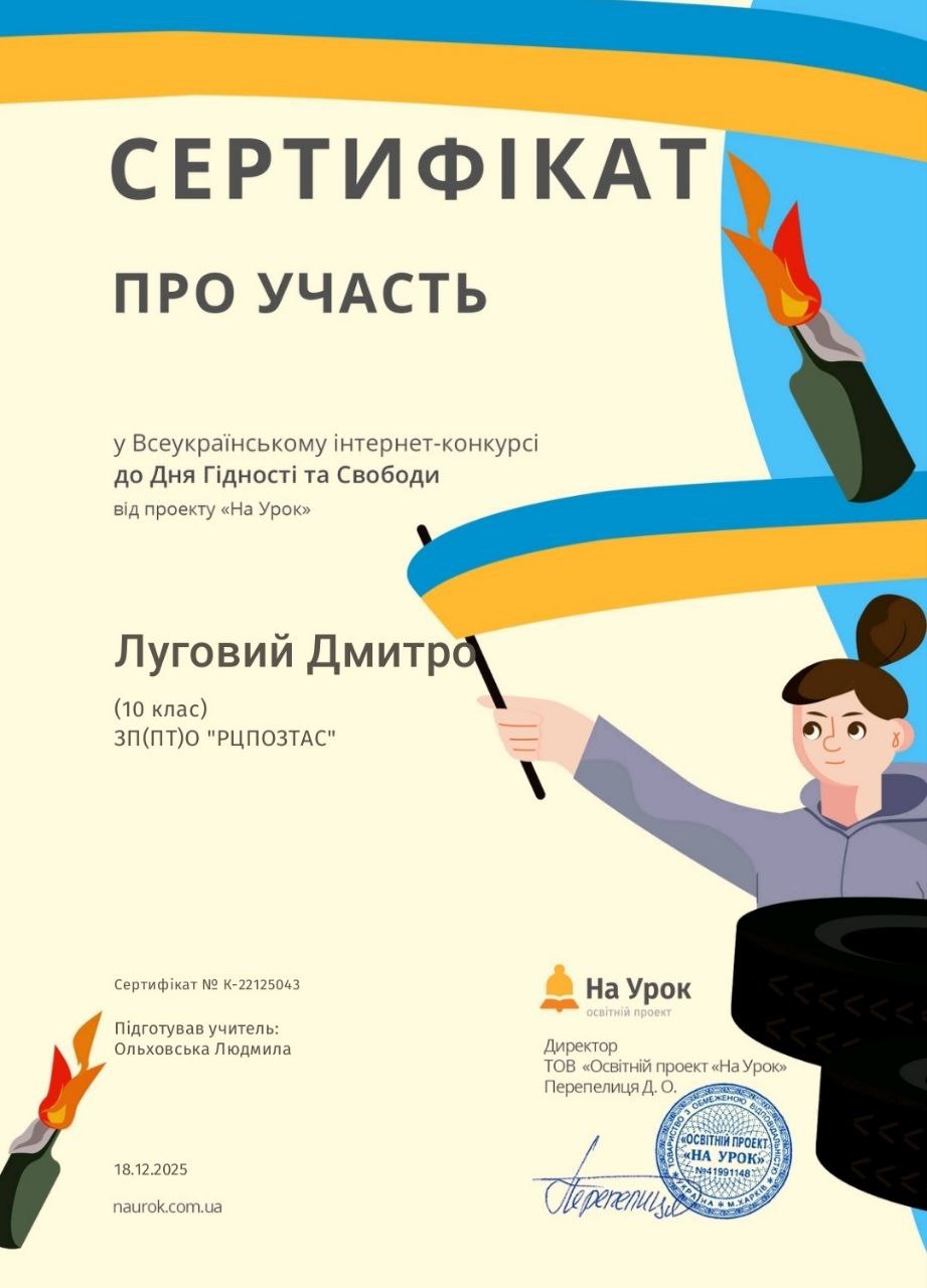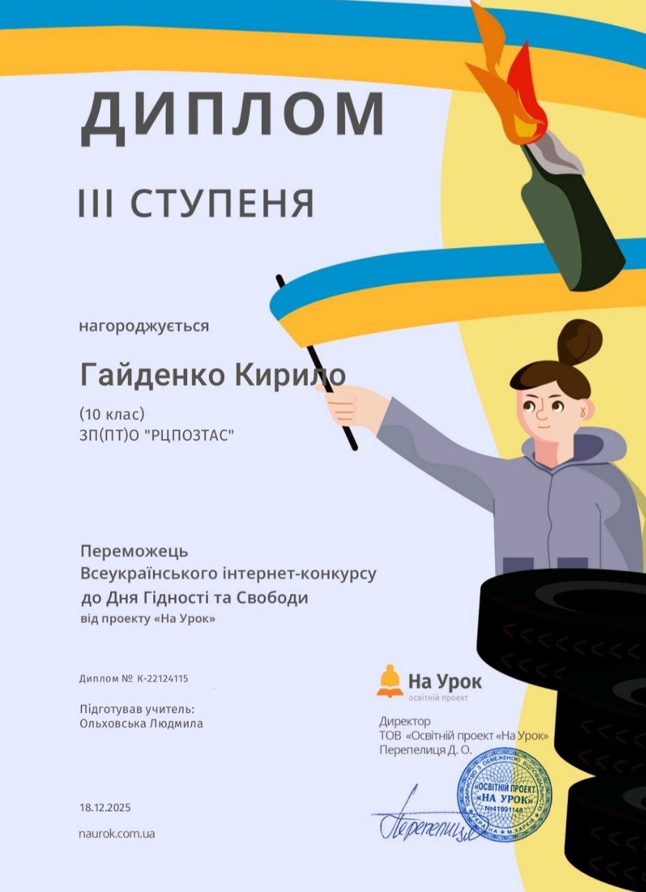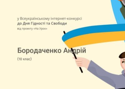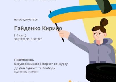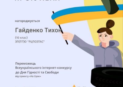 Завершився Всеукраїнський інтернет-конкурс до Дня Гідності та Свободи. Студенти групи 1Т-25 активно долучилися до виконання інтерактивних завдань конкурсу, які допомогли їм з’ясувати значення понять «гідність», «свобода», «відповідальність», більше дізналися про те, як зароджувалося народовладдя в Україні, а також мали змогу доповнити своє уявлення про обов’язки та права громадян.
